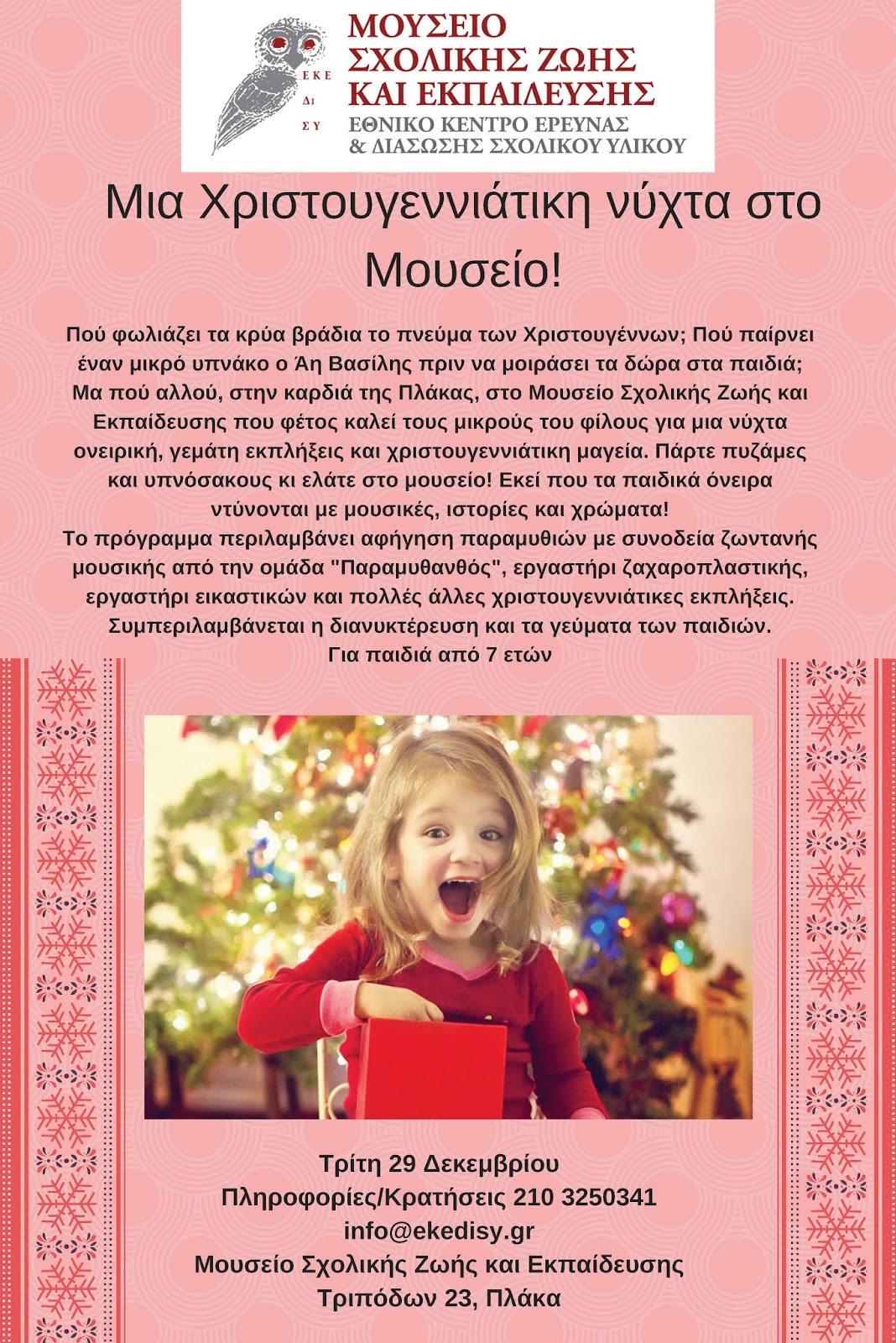 Μα πού αλλού, στην ....καρδιά της Πλάκας, στο Mουσείο Σχολικής Ζωής και Εκπαίδευσης που φέτος καλεί τους μικρούς του φίλους για μια νύχτα ονειρική, γεμάτη εκπλήξεις και χριστουγεννιάτικη μαγεία. Πάρτε πιτζάμες και υπνόσακους κι ελάτε στο μουσείο! Εκεί που τα παιδικά όνειρα ντύνονται με μουσικές, ιστορίες και χρώματα!