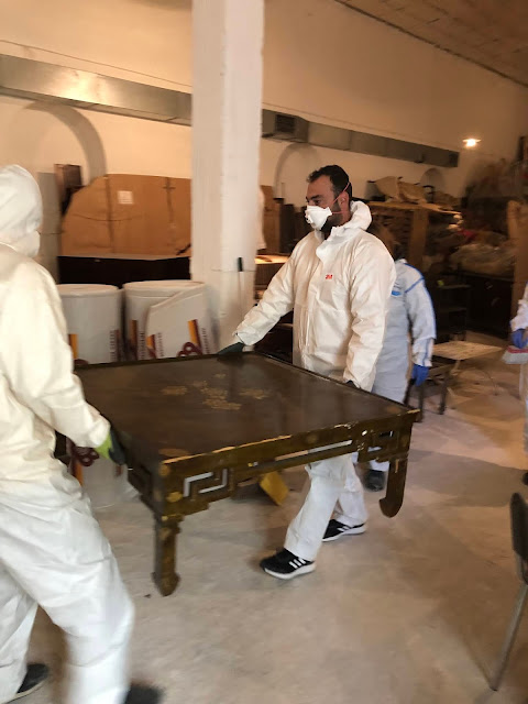 Στον τεράστιο αριθμό αντικειμένων που είναι συσκευασμένα σε κιβώτια εντοπίζονται έπιπλα εποχής, φωτιστικά, χαλιά και έργα τέχνης.